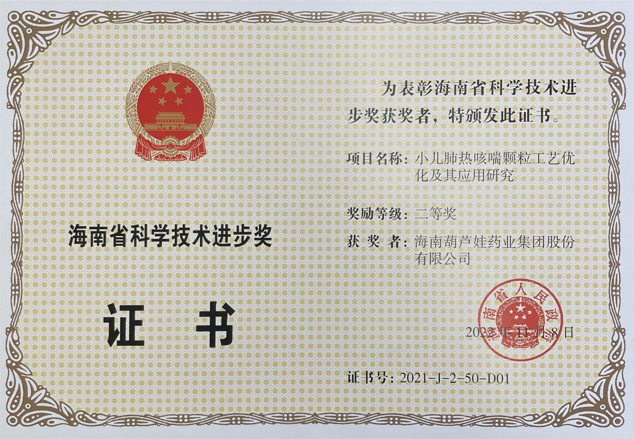 为此,小儿肺热咳喘颗粒的制备方法获得了第二十一届中国专利优秀奖(2019年),专利申请号:ZL201010134951,此次作为专利技术的应用,获得了2021年度海南省科学技术进步奖二等奖。在此之前,银娱优越会牌小儿肺热咳喘颗粒还多次被授予“临床价值中成药品牌”、“中国连锁药店最具合作价值单品”,荣登“中国医药品牌榜”。